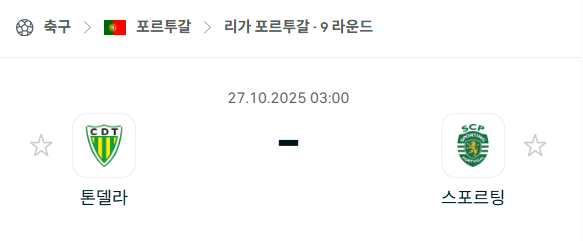 2025년 10월 27일에 열리는 포르투갈 프리메이라리가의 톤델라와 스포르팅 리스본 경기 분석입니다. 이번 경기는