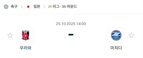 입니다. 우라와는 홈에서의 점유율 유지와 전환 속도가 안정된 팀으로, 경기 전체를 통제하는 능력이 뛰어납니다. 반면 마치다는 아시아챔피언스리그(ACL) 원정 이후 피로 누적이 심화되어, 압박 유지력과 수비 간격이 무너진 상황입니다. 홈에서 체력적으로 여유가 있는 우라와가 템포를 주도하며 마치다의 전술적 허점을 공략할 가능성이 높습니다.