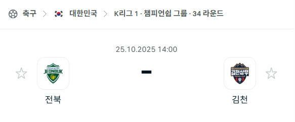 리그 우승을 확정한 전북현대가 홈에서 김천상무를 상대하는 경기로, 양 팀 모두 승부욕보다는 체력 안배와 경기 운영에 초점을 맞출 가능성이 높습니다.