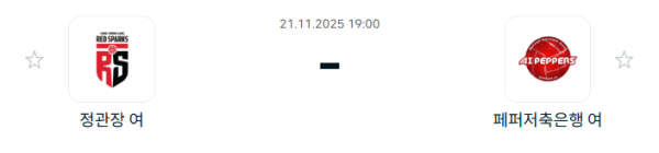 2025년 11월 21일에 열리는 V리그 대전 정관장 레드스파크스 페퍼저축은행 AI 페퍼스 배구단 경기 분석입니다. 이번 경기는 최근 2연패에 빠진 대전 정관장 레드스파크스과 상승 흐름을 되찾으며 연승을 이어가고 있는 페퍼저축은행 AI 페퍼스 배구단의 맞대결입니다. 정관장 레드스파크스은 외국인 선수 자네테의 부재와 핵심 선수들의 연속 결장 속에서 공격 효율이 크게 떨어졌고, 세터진의 불안정함도 경기력 저하로 이어지고 있습니다. 반면 페퍼저축은행 AI 페퍼스 배구단은 조이를 중심으로 한 삼각 공격 체계가 견고하게 운영되고 있으며 경기의 집중력과 공수 밸런스가 안정적으로 유지되고 있습니다. 최근 흐름과 전력 상황을 종합하면 원정팀인 페퍼저축은행 AI 페퍼스 배구단의 우세가 예상되는 경기입니다.