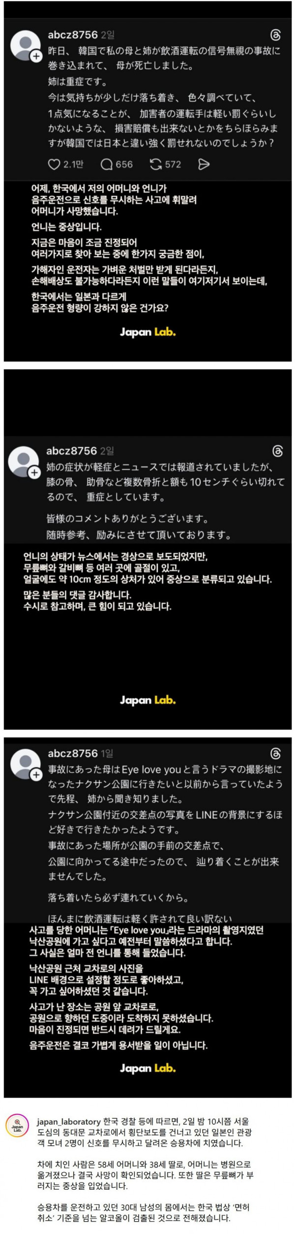 [유머] 한국에서 음주운전 때문에 사망한 일본인 가족이 올린 글.jpg