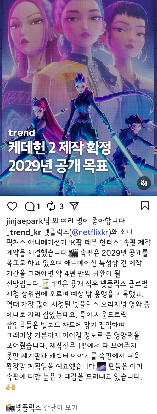 [유머] 케데헌 2 제작 확정. 2029년 공개 목표