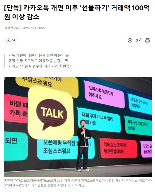 [사회] 카카오톡 개편 이후 ‘선물하기’ 거래액 100억원 이상 감소