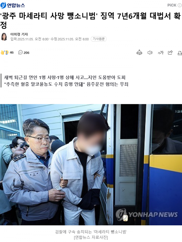 [사회] '광주 마세라티 사망 뺑소니범' 징역 7년6개월 대법서 확정