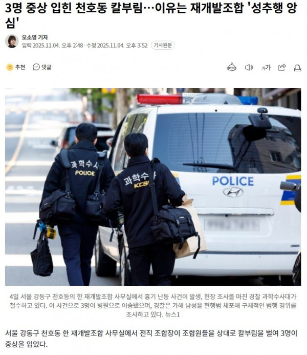 [사회] 3명 중상 입힌 천호동 칼부림…이유는 재개발조합 '성추행 앙심'