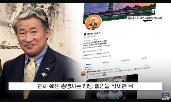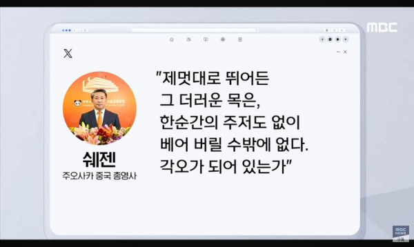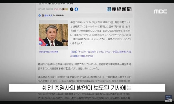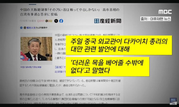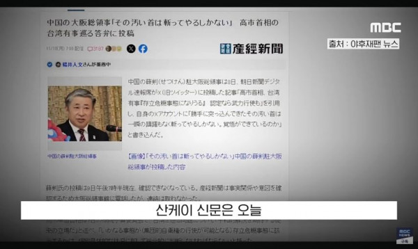[사회] 중국 현직 주일 외교관 "다카이치 총리 참수 하겠다"
