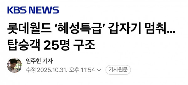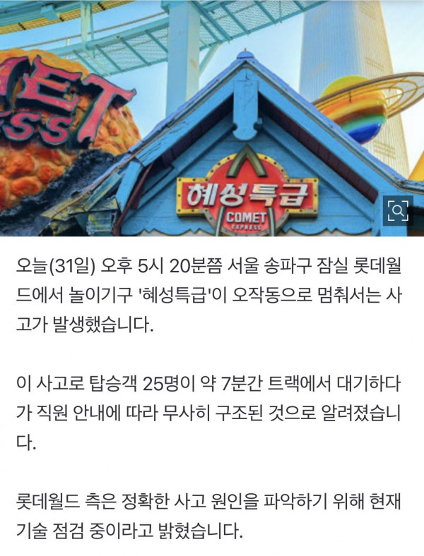 [사회] 롯데월드 ‘혜성특급’ 갑자기 멈춰…탑승객 25명 구조