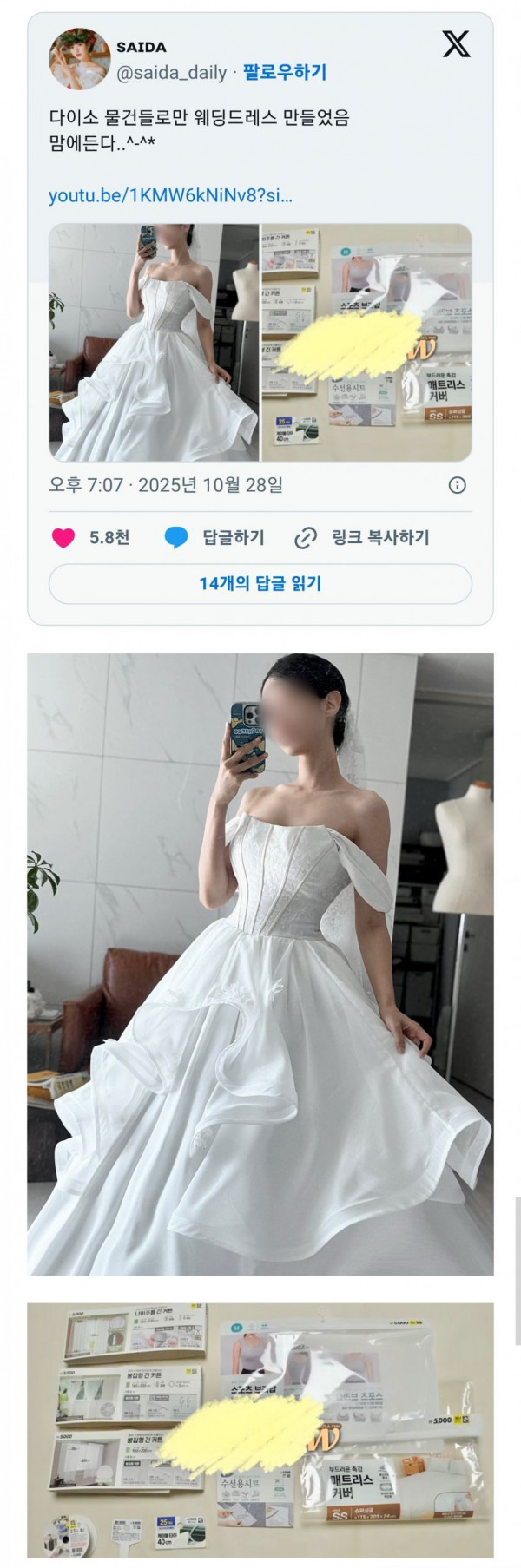 [유머] 다이소 물건들로만 웨딩드레스 만들었음