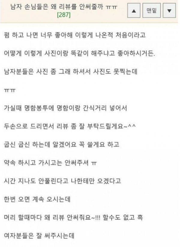 [유머] 남자 손님들이 리뷰를 잘안쓰는 이유ㅋㅋㅋㅋㅋ