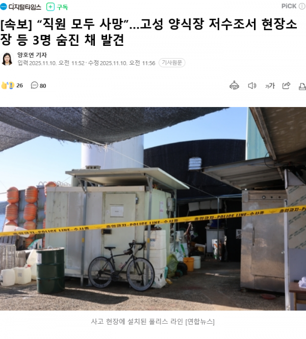[사회] 고성 양식장 저수조서 현장소장 등 3명 숨진 채 발견