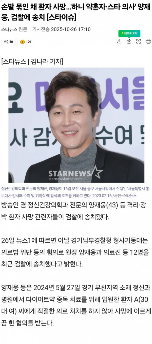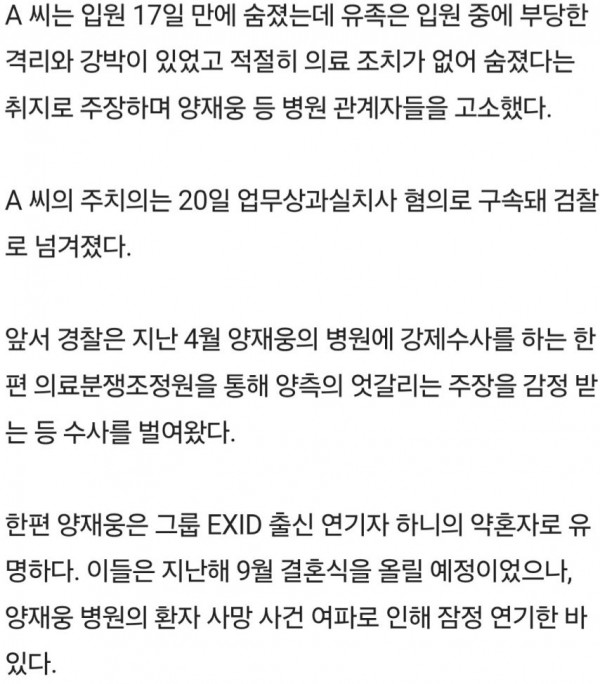 [사회] 손발 묶인 채 환자 사망…'하니 약혼자·스타 의사' 양재웅, 검찰에 송치