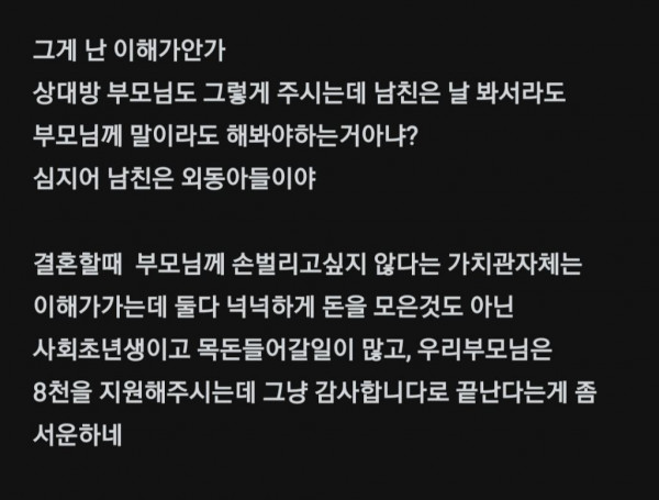 [기타] 부모님께 결혼자금 절대 안빌리겠다는 남친한테 서운한 여자