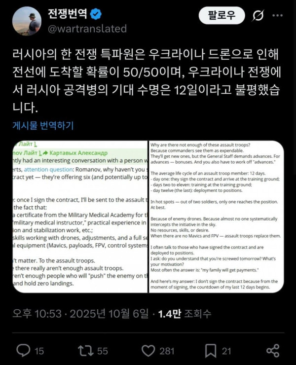 [유머] 러시아 공격병의 기대수명은 12일