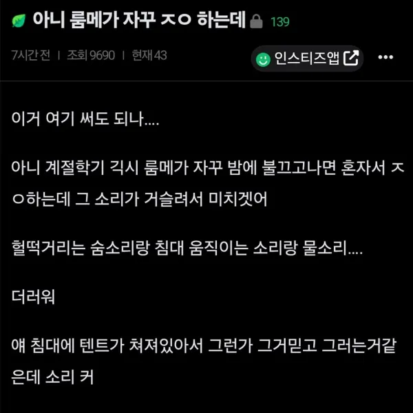 [약후] 룸메가 밤에 자려는데 자꾸 자위해서 못자겠어..