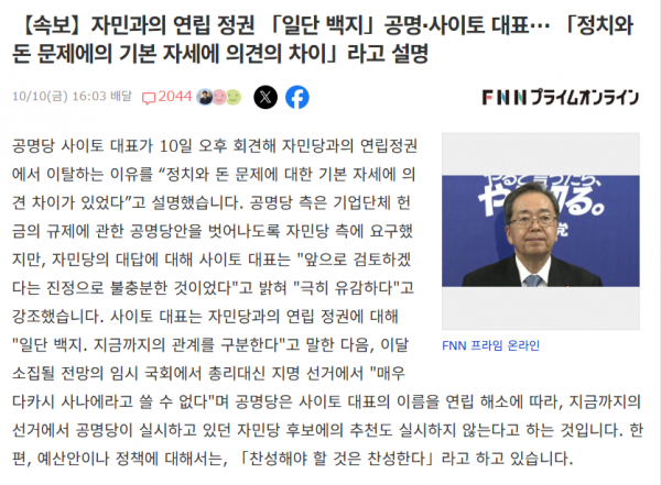 [사회] 일본 자민당 연립정권 붕괴