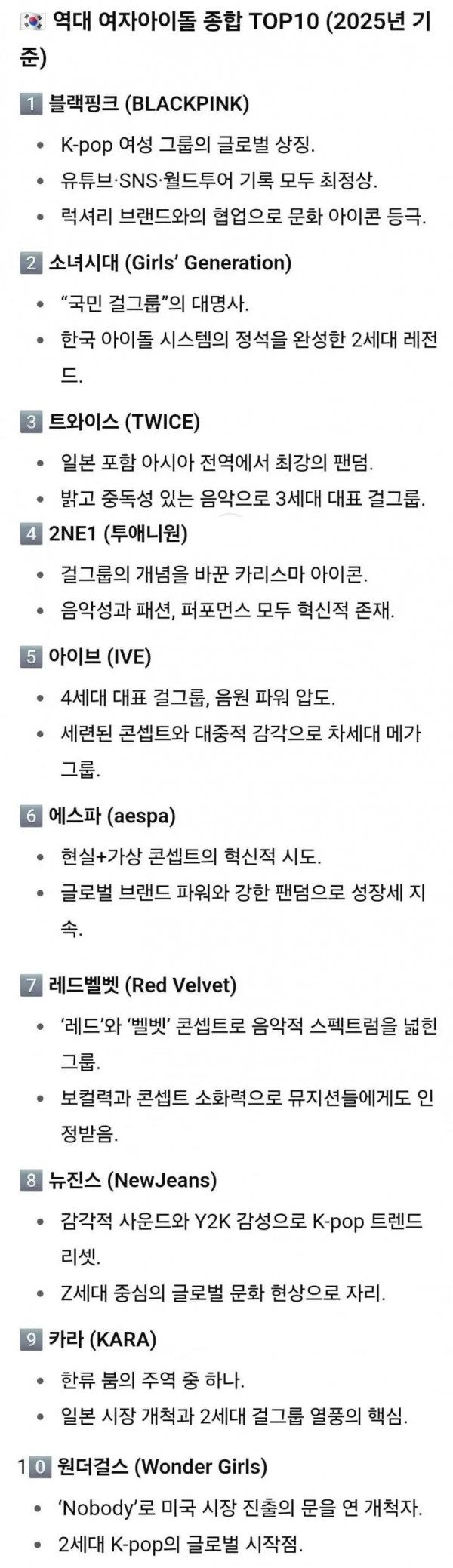 [유머] 챗GPT가 선정한 역대 남녀 아이돌그룹 TOP10