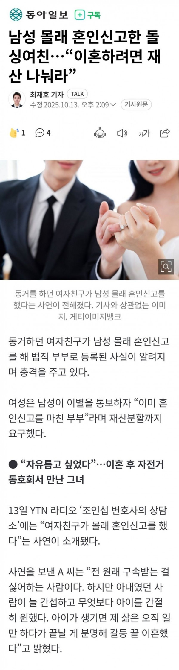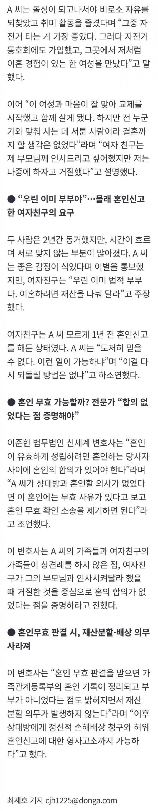 [사회] 남성 몰래 혼인신고한 돌싱 여친