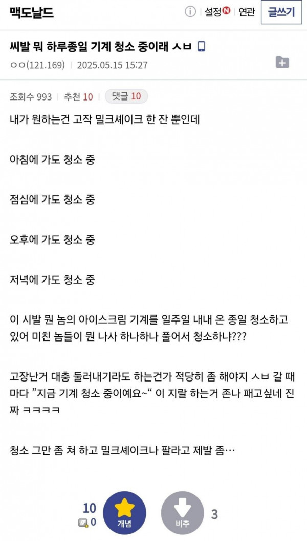 [유머] 맥날 밀크쉐이크 4번이나 청소한다고 못먹음