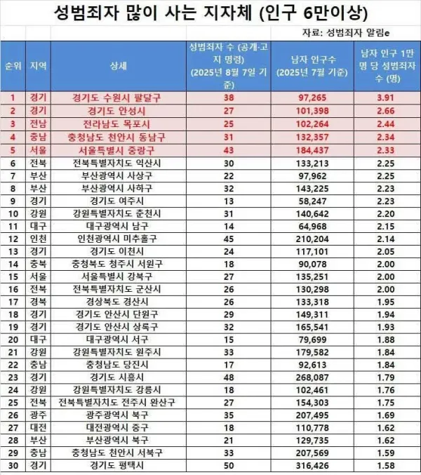 [기타] 2025년 성범죄자 많은 도시와 적은 도시
