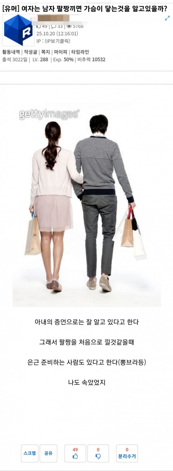[유머] 여자를 남자 팔짱끼면 닿는다는걸 알고 있을까?