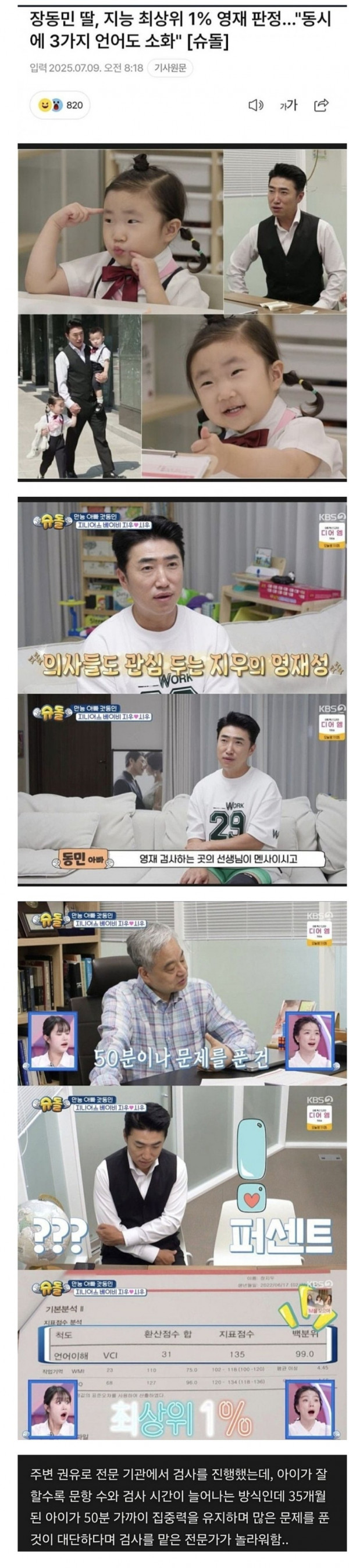 [유머] 장동민 35개월 딸 지능 최상위 1% 영재 판정
