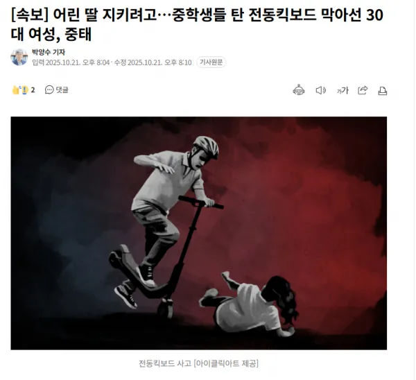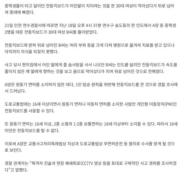 [사회] 어린 딸 지키려고…중학생들 탄 전동킥보드 막아선 30대 여성, 중태