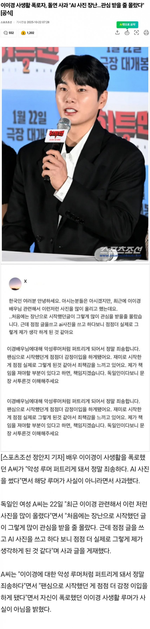 [엽기] 이이경 사생활 폭로자, 돌연 사과 "AI 사진 장난…관심 받을 줄 몰랐다"