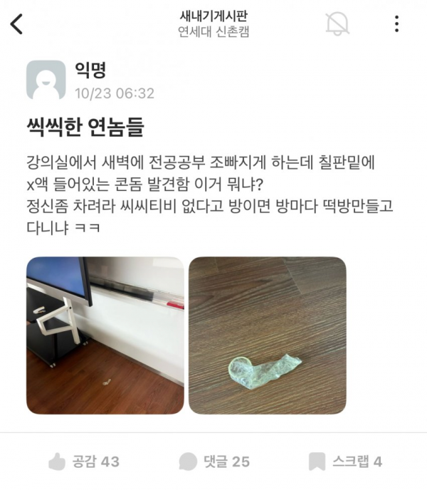 [엽기] 연세대 강의실 콘돔 ㄷㄷ