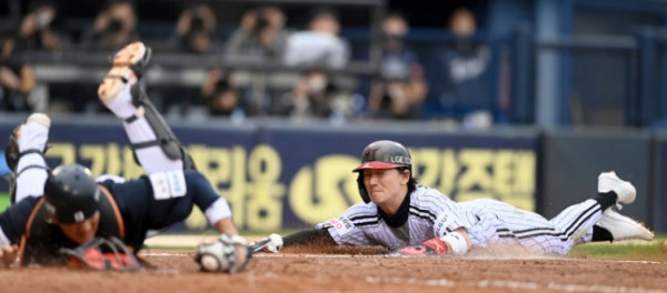 LG는 곧바로 5회 말 반격에 성공했다. 1사 후 신민재가 우중간을 가르는 3루타를 치고 나갔다. 빠른 발이 만든 장타였다. 한화도 LG처럼 전진 수비를 펼쳤다. 오스틴 딘이 3루 땅볼을 때렸는데 결과는 달랐다. 신민재는 재빠르게 홈으로 파고 들었다. 배트에 공이 맞는 순간, 주자가 뛰는 '콘택트 플레이'였다.