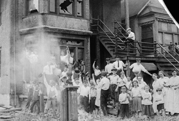 1919년 시카고에서 인종 폭동 중에 방화한 흑인 가족의 집 근처에 있는 백인 아이들.