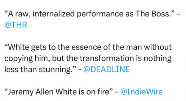 텔룰라이드 영화제에서 첫 공개된 부류급 스프링스틴 전기 영화인 '스프링스틴 - Deliver me from nowhere"에서 주인공역할 맡은 제레미 알렌 화이트 연기 호평