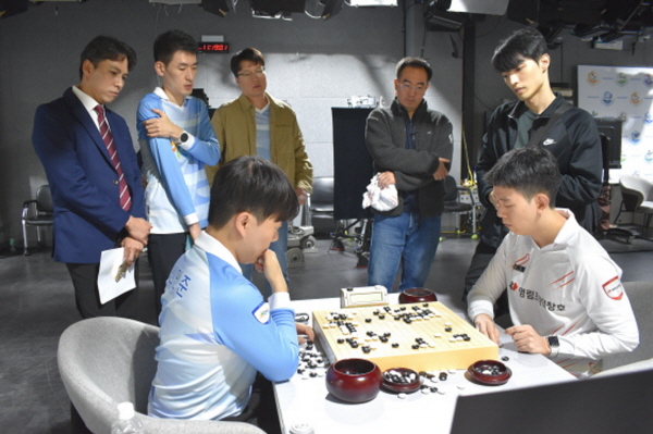이날 수려한 합천의 검토실은 유난히 단촐했다. 김승진(3지명)과 박지현(4지명)이 같은 날 중국 청두시에서 열린 ‘녜웨이핑배 바둑 마스터스’에 출전하면서 2명의 공백이 생긴 탓이다. 바둑리그 운영 규정에 따르면, 해외에서 개최되는 세계대회 참가로 결원이 발생할 경우, 최소 인원(3명)으로 경기당 1인 1회에 한해 중복 출전할 수 있다. 결국 수려한 합천은 최소 인원 3명만으로 라인업을 꾸려야 하는 불리한 상황을 맞았다.