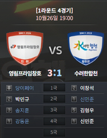 우승후보 1순위로 꼽히는 영림프라임창호가 막강한 화력을 과시했다. 24일 한국기원 바둑TV 스튜디오에서 열린 2025-2026 KB국민은행 바둑리그 1라운드 4경기에서 영림프라임창호가 수려한 합천을 3:1로 제압했다.