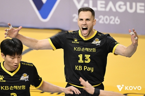 (서울=연합뉴스) KB손해보험 비예나가 26일 의정부 경민대체육관에서 열린 프로배구 남자부 대한항공과 홈 경기에서 득점한 뒤 기뻐하고 있다. [한국배구연맹 제공. 재판매 및 DB 금지]