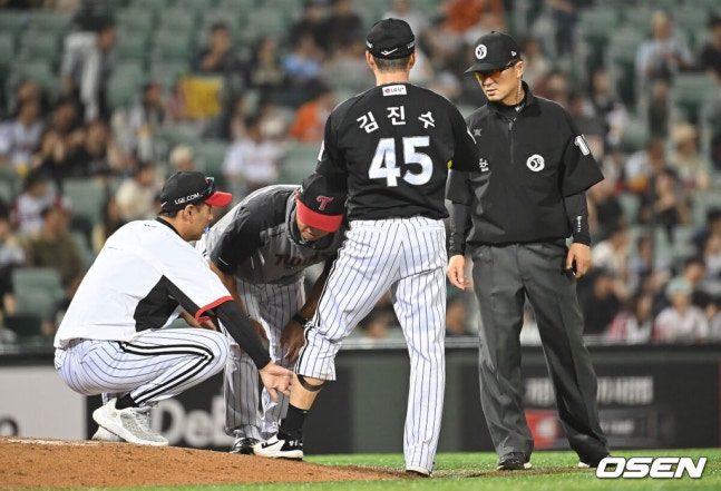 [OSEN=울산, 이석우 기자] 25일 울산 문수야구장에서 2025 신한 SOL 뱅크 KBO 리그 롯데 자이언츠와 LG 트윈스의 경기가 열렸다. 홈팀 롯데는 감보아가, 방문팀 LG는 손주영이 선발로 나섰다.LG 트윈스 김진수가 9회말 2사 1루 롯데 자이언츠 전준우의 타구에 맞고 부상 부위를 보고 있다. 2025.09.25 / [email protected]