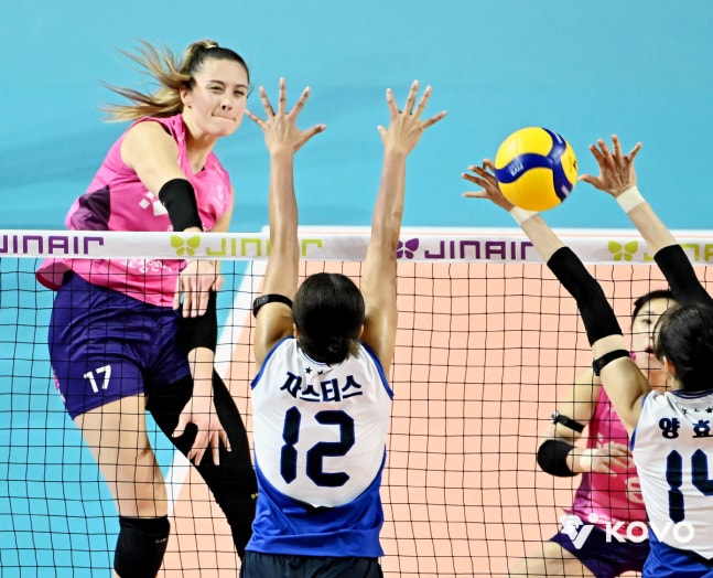 현대건설과 극명하게 대비된다. 국내 아웃사이드히터 정지윤이 22점을 몰아쳤다. 공격 점유율 30%가 넘는 선수가 없을 정도로 다양하게 분산됐다. 외국인선수 카리 가이스버거(등록명 카리)가 18점에 공격 성공률 33.33%로 다소 아쉬웠는데 국내선수들 활약이 든든했다. 미들블로커 양효진이 15점을 폭발했다.