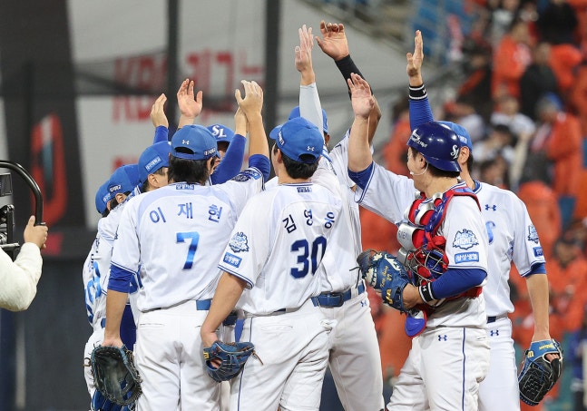 삼성 선수들이 지난 22일 대구 삼성라이온즈파크에서 열린 2025 프로야구 KBO리그 포스트시즌 플레이오프 4차전 한화와의 경기에서 승리한 뒤 세리머니를 하고 있다. 연합뉴스