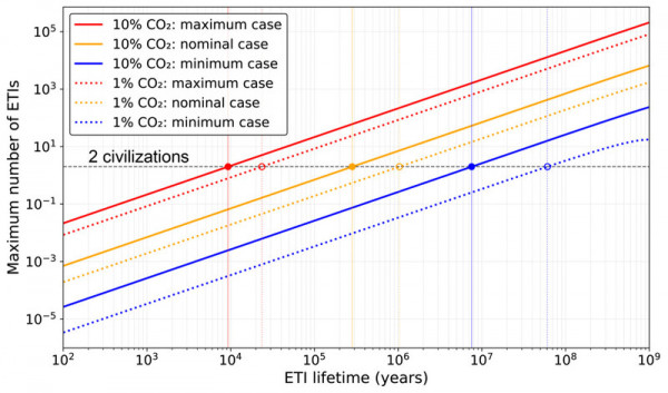 연구진은 모든 요소를 종합할 때 4천억개의 별이 있는 우리 은하에서 우리 문명과 같은 시기에 외계 기술 문명이 단 하나라도 존재할 수 있으려면, 생물권 존속 기간이 가장 긴 이산화탄소 10% 행성을 기준으로 최소 28만년은 존속해야 한다는 계산 결과가 나왔다고 밝혔다. 그런 문명이 10개 있으려면 기술 문명의 평균 수명이 1천만년 이상이어야 한다. 연구진은 따라서 우리가 또 다른 지적 문명을 발견한다면 그 문명은 우리보다 훨씬 오래되고 발전된 형태일 것이라고 주장했다.