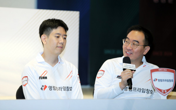 ▲ "강동윤 선수가 37세라는 게 말이 됩니까. 점점 젊어지고 점점 랭킹도 끌어올리고 있고, 모든 면에서 최고의 주장이라 생각합니다. 저는 강동윤 선수를 믿고 버스를 타겠습니다." (영림프라임창호 박정상 감독)