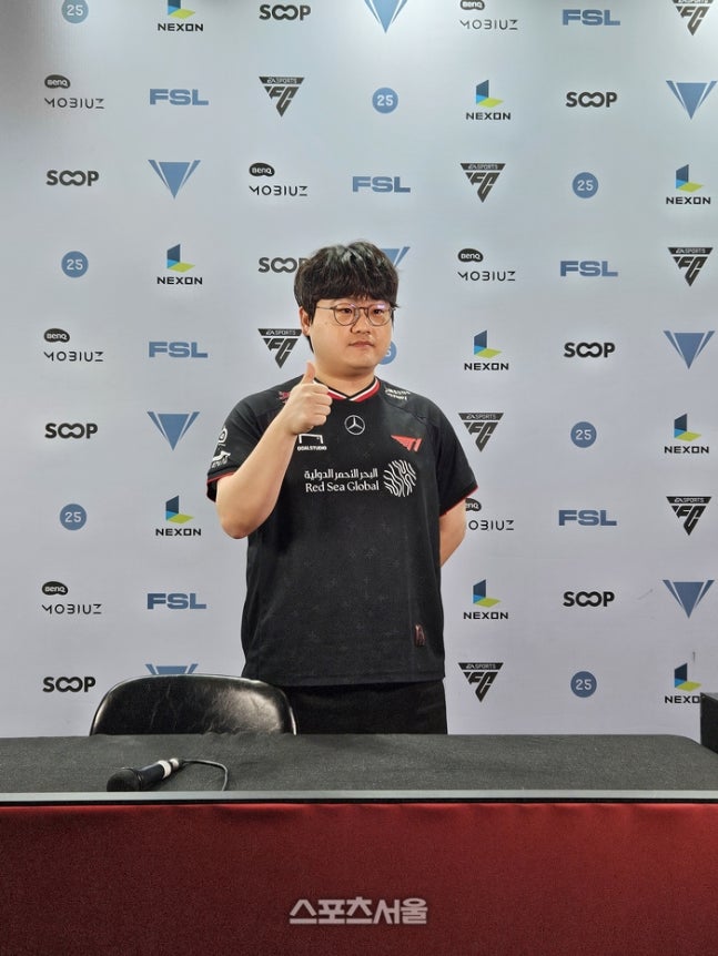 T1 강준호가 18일 서울 잠실DN콜로세움에서 열린 2025 FSL 서머 B조 승리 후 취재진 인터뷰 후 포즈를 취하고 있다. 잠실 | 강윤식 기자 [email protected] |