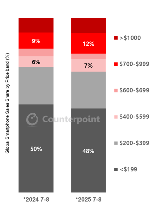 22일 시장조사기관 카운터포인트리서치에 따르면 2025년 7~8월 스마트폰 시장이 판매량 기준 전년 동기 대비 2% 성장했다. 이 기간 동안 400~599달러 및 700~999달러 가격대 스마트폰의 판매가 두 자릿수 이상 증가세를 기록했다.