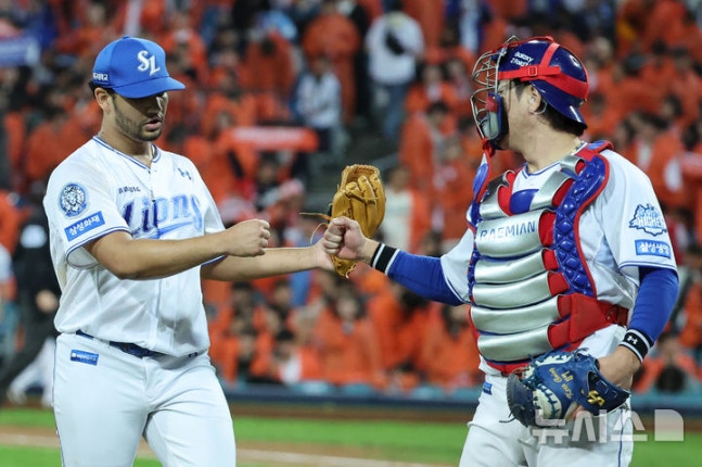 [대구=뉴시스] 이무열 기자 = 22일 대구 수성구 삼성라이온즈파크에서 열린 2025 신한 SOL 뱅크 KBO 포스트시즌 플레이오프 4차전 한화 이글스와 삼성 라이온즈의 경기, 7회초 2사 주자 2,3루 상황에서 삼성 가라비토가 한화 문현빈을 플라이아웃 시킨 뒤 더그아웃에 들어서며 포수 강민호와 기뻐하고 있다. 2025.10.22. [email protected]