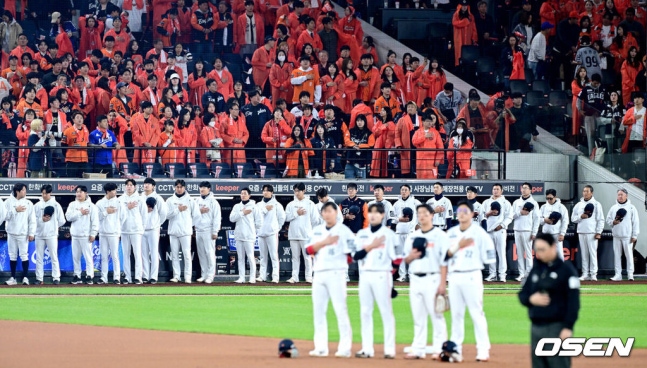 [OSEN=최규한 기자] 한화 선수들이 국민의례를 하고 있다. 2025.10.24 / [email protected]