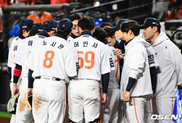 [OSEN=대전, 지형준 기자] 6회말을 앞두고 한화 선수들이 미팅을 하고 있다. 2025.10.31 /[email protected]