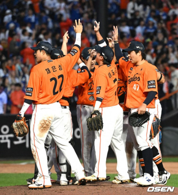 [OSEN=대전, 이대선 기자] 한화 선수들이 승리의 기쁨을 나누고 있다. 2025.10.18 /[email protected]