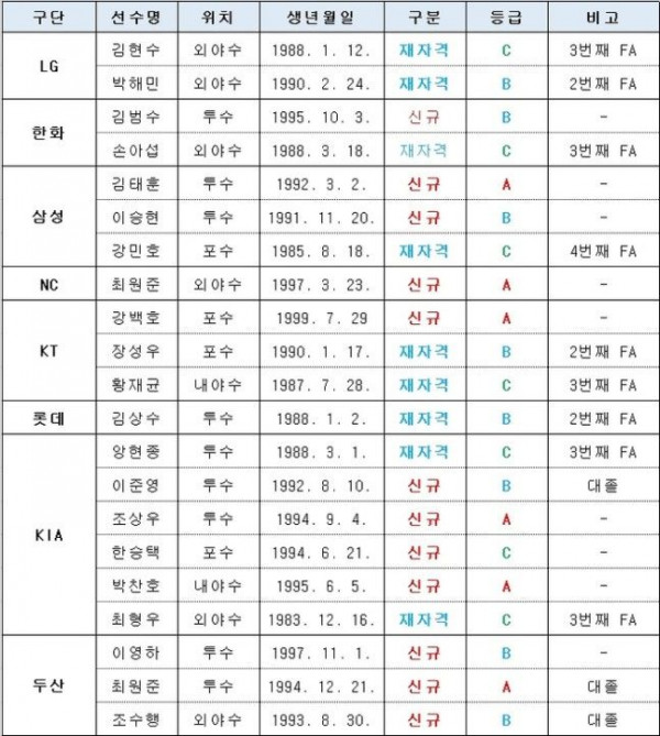 1년이 지났다. 한국야구위원회(KBO)가 8일 최종 FA 승인 명단을 내놨다. 총 21명이다. 강백호와 박찬호가 최대어로 꼽힌다. LG 통합우승 멤버 김현수와 박해민도 FA다. 한화 한국시리즈 진출의 주역 김범수도 있고, 40대 나이에도 여전히 리그 최고 타자로 군림하는 최형우 또한 FA가 됐다.