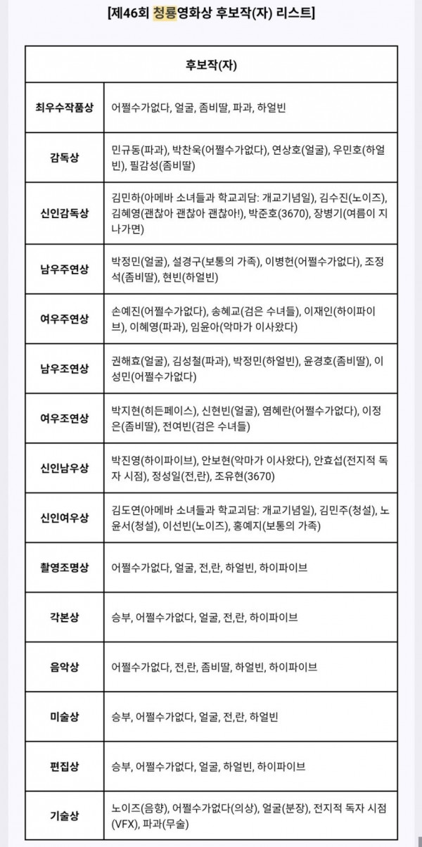 오늘 46회 청룡영화상 후보가 발표되었습니다