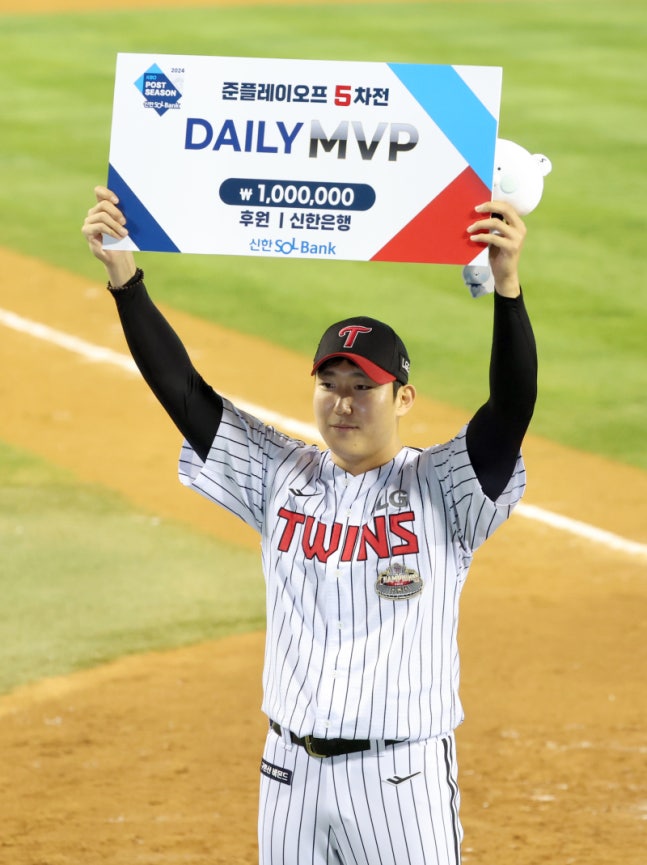 11일 오후 잠실야구장에서 열린 KT위즈와 LG트윈스의 2024 신한쏠뱅크 KBO포스트시즌 준플레이오프 5차전. LG가 4-1 승리, 플레이오프에 진출했다. 경기종료후 시상식에서 LG 손주영이 데일리 MVP를 받고있다. 잠실=정시종 기자 [email protected] /2024.10.11.