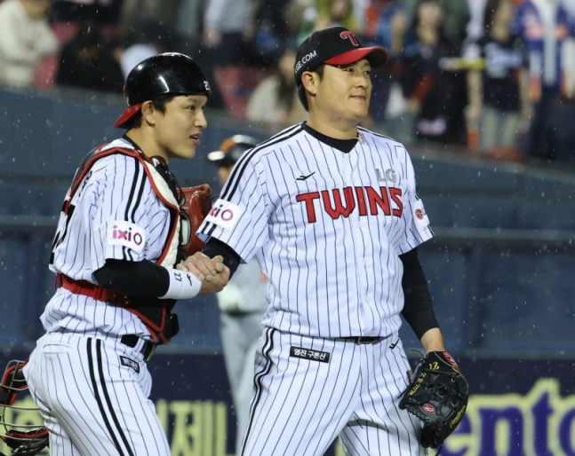 27일 오후 잠실야구장에서 열린 2025 프로야구 한화 와 LG 경기. LG가 2-1 승리했다. 경기 종료 후 투수 김강률과 포수 박동원이 손을 맞잡고 있다. 잠실=정시종 기자 [email protected] /2025.03.27.
