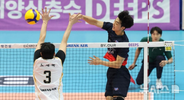 [수원=뉴시스] 김선웅 기자 = 8일 경기 수원시 장안구 수원실내체육관에서 열린 2024 한국-이탈리아 남자배구 글로벌 슈퍼매치 수원대회 팀 KOVO와 이탈리아 베로 발리 몬차의 경기, 몬차 이우진이 스파이크를 날리고 있다. 2024.09.08. [email protected]